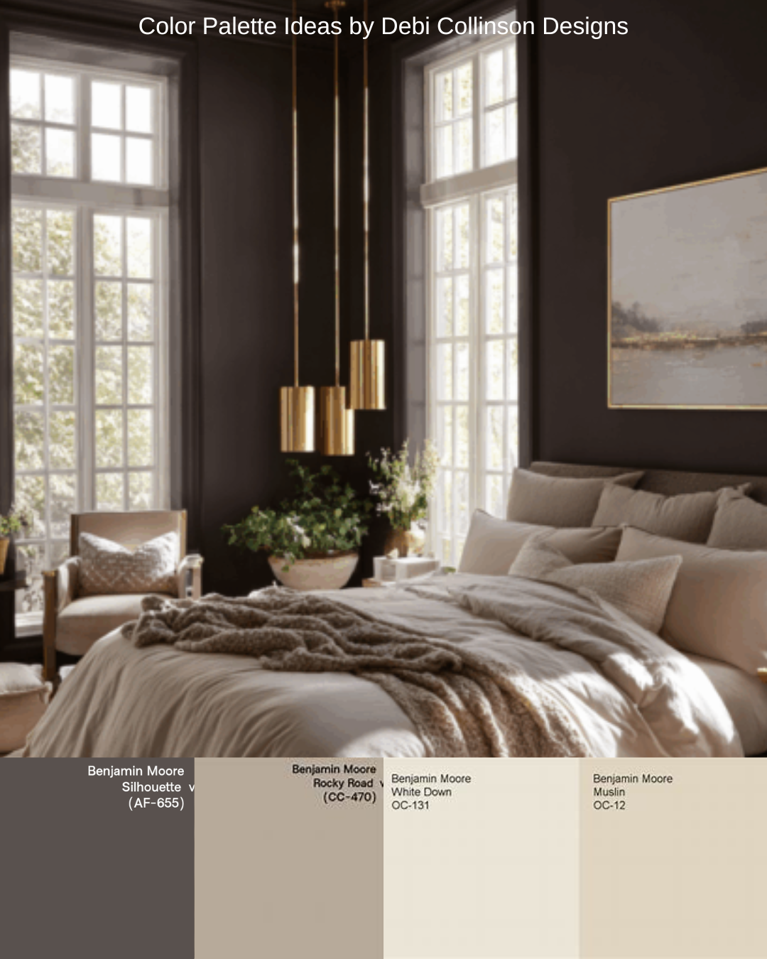 In our bedroom above, we see how Benjamin Moore Silhouette is the wall color, and the other existing colors in the room, BM Rocky Road, BM White Down and BM Muslin compliment the main paint color in this gorgeous monochromic romantic bedroom. Using colors that compliments the main paint color gives a cohesive look and feel to a room.