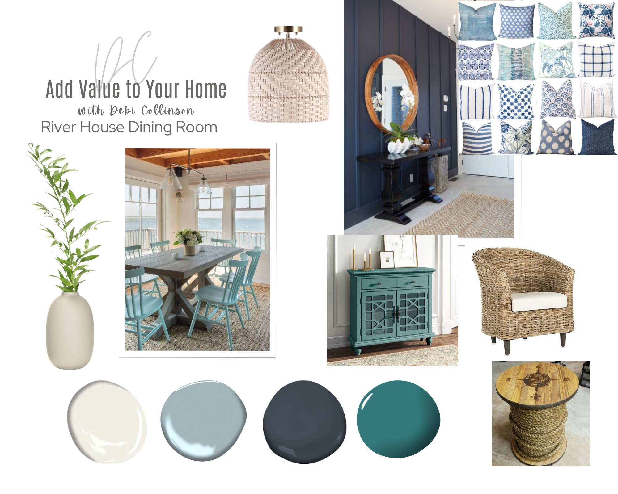 I created the above mood board for a coastal dining room that has an amazing view of a river. The gorgeous river view was the inspiration piece for this mood board, and the colors flowed from the coastal | beach look.